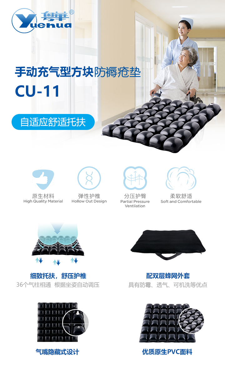 YHMED adopts the Dynamic Pressure Monitoring System totrace the real-time internal pressure of the cushion. CU-11 Seat Cushion provides the best support anddecompression effect for the user.