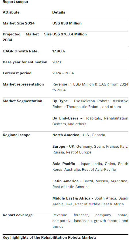 Covina, Feb. 21, 2024 (GLOBE NEWSWIRE) -- “According to the recent research study, the Rehabilitation Robots Market size was valued at about USD 838.0 Million in 2024 and expected to grow at CAGR of 17.90% to extend a value of USD 3196.7 Million by 2034.”