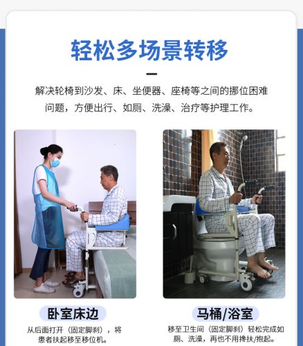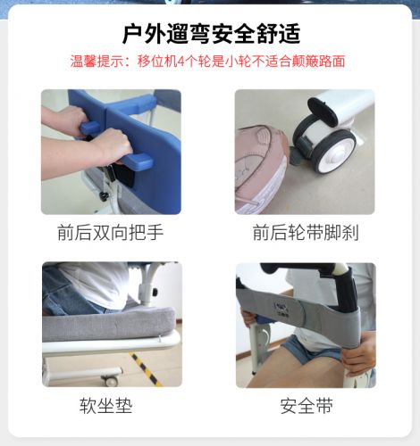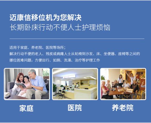 多功能移位機——有效解決了行動不便人士在沙發(fā)、床、坐便器、座椅等之間相互移位的痛點,以提高行動不便人士的生活質量。護理人員通過使用移位機可以大大減輕了工作強度,提高了護理效率,項目產(chǎn)品可以解放勞動力或者減輕護理人員的負擔。