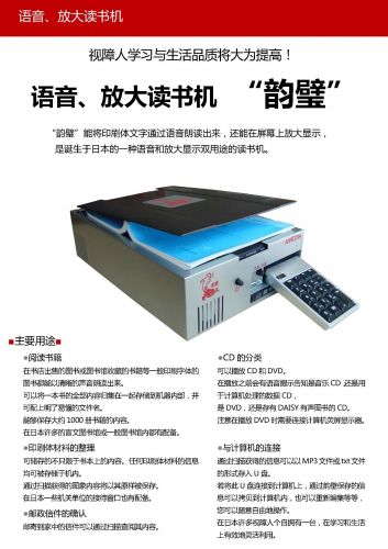 1. 語音閱讀模式:把掃描讀入的文章數(shù)據(jù)以優(yōu)雅易聽的語音讀出。 2. 放大閱讀模式(助視器功能):把掃描讀入的圖像數(shù)據(jù)在屏幕上放大顯示,最大放大倍率40倍(17寸顯示器), 6級(jí)放大顯示;可調(diào)整對(duì)比度和顏色;同時(shí)也可以使用操作鍵進(jìn)行語音讀出。 3. CD模式:可以播放CD/DVD/Daisy光盤(Daisy2.0及2.02)。 4. USB模式:可以播放U盤中的Word、Excel、Pdf、Htm
