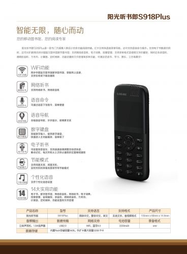 1.提供WiFi連網(wǎng)、藍(lán)牙外放功能; 2.同步中國(guó)盲文圖書館數(shù)字圖書館,獲取網(wǎng)上資源,在線或下載后播放。 3.全程語音導(dǎo)航,步步提示。 4.智能數(shù)字輸入,提供數(shù)字鍵盤; 5.主菜單界面支持按數(shù)字鍵快捷進(jìn)入常用功能模塊; 6.支持語音命令進(jìn)入功能模塊并進(jìn)行菜單控制; 7.支持閑置關(guān)屏、閑置關(guān)機(jī)、定時(shí)關(guān)機(jī)和屏幕亮度調(diào)節(jié)等節(jié)能模式; 8.電子書支持發(fā)音人角色、語速、語調(diào)、語音音效等個(gè)性化設(shè)置;