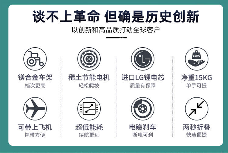 智能黑科技產品 1、鎂合金框架+稀土永磁電機 2、進口LG鋰電芯 可帶上飛機 3、兩秒可折疊 凈重15kg單手可提 4、電磁剎車 松手即停 5、英國PG/Micon控制器 6、與美國PRIDE同平臺生產