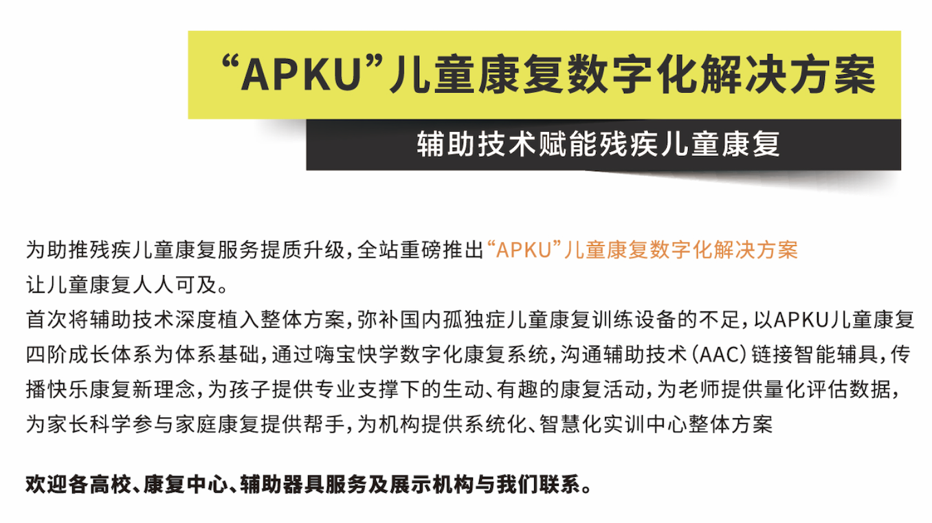打造智慧化解決方案,讓兒童康復(fù)人人可及 為助力兒童康復(fù)服務(wù)提質(zhì)升級,全站以輔助技術(shù)為核心,賦能兒童康復(fù)全過程 推出兒童康復(fù)數(shù)字化實(shí)訓(xùn)解決方案,本方案以APKU兒童康復(fù)四階段成長體系為基礎(chǔ),通過數(shù)字化康復(fù)系統(tǒng)及溝通輔助技術(shù)(AAC),鏈接感統(tǒng)、言語等多鞥例康復(fù)智能化訓(xùn)練設(shè)備,傳播快樂康復(fù)新理念。