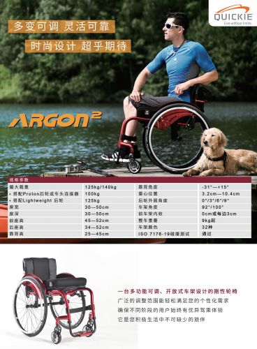 Argon2 是一臺多功能可調(diào)、開放式車架設(shè)計(jì)的剛性輪椅,廣泛的調(diào)整范圍能輕松滿足您的個(gè)性需求,確保不同階段的用戶始終有優(yōu)異的駕乘體驗(yàn),它是您積極生活不可缺少的旅伴。