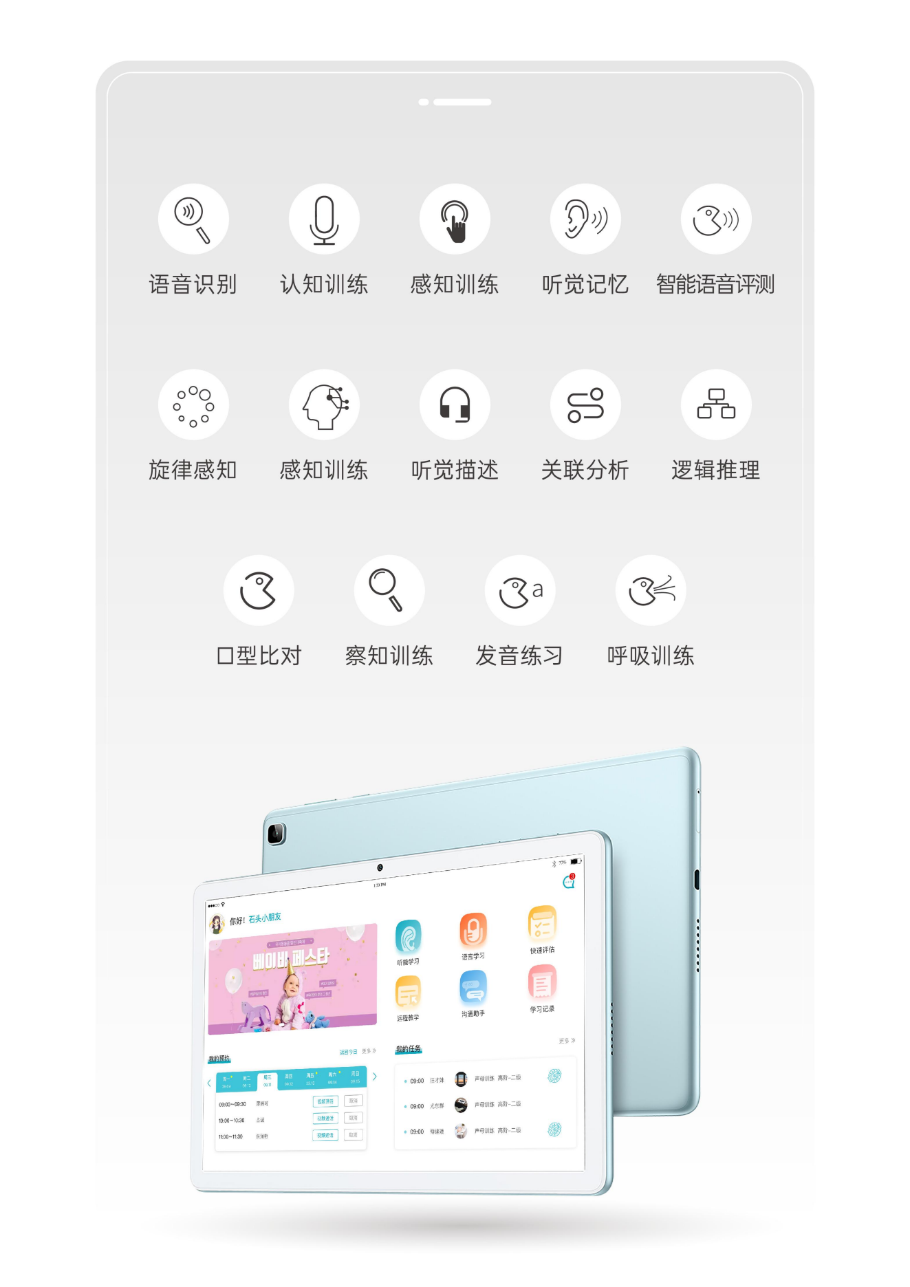小南聽說聽力語言智能康復(fù)助手是一款基于人工智能和數(shù)字康復(fù)技術(shù)的語言康復(fù)產(chǎn)品,主要面向各類語言、認(rèn)知及聽力障礙的兒童,由一套智能訓(xùn)練系統(tǒng)和一套智能硬件設(shè)備組成,目前主要有專業(yè)版和智享版兩種硬件形態(tài),可實(shí)現(xiàn)智能化的家庭/機(jī)構(gòu)全方位康復(fù)訓(xùn)練。