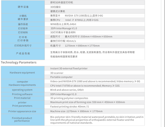 硬件設(shè)備:即時30外團(tuán)定打印機(jī)、硬件設(shè)備、3D掃描佼、便攜式計算機(jī)。 成型尺寸:最大打印尺寸:550mmx450mmx650mm,最快打印行程:40mm/s 產(chǎn)成品性能:生物高分子親膚材質(zhì),防水、輕便,無皮膚刺激性,符合骨科外固定支具各項物理性能指標(biāo)和國家規(guī)范要求