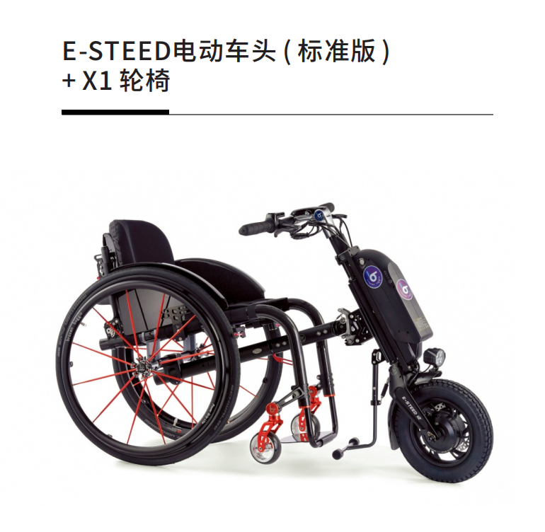E-steed電動(dòng)handbike,可以和手動(dòng)輪椅配套構(gòu)成一種新式的電動(dòng)輪椅,既有手動(dòng)輪椅的靈活性,又具備了接近電動(dòng)自行車的行駛速度和通過能力,很好的提升使用體驗(yàn)和出行效率。 E-steed最快速度25KM/H, 最大續(xù)航里程60公里,具備倒擋,集成前照明燈和警示喇叭。 BRAXEN BAGGIO首創(chuàng)的中置式鏈接提供穩(wěn)定可靠的使用感受,可以無損拆裝,對輪椅車架沒有負(fù)面影響。