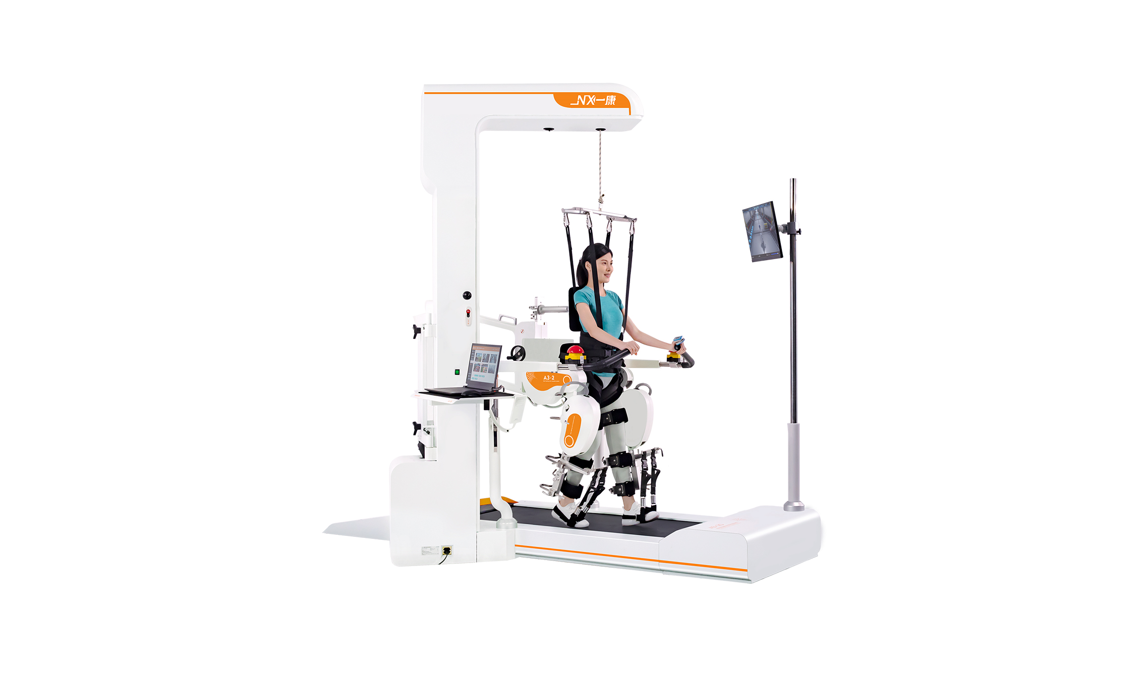 這是一款針對(duì)步行功能障礙進(jìn)行高效康復(fù)訓(xùn)練的下肢康復(fù)機(jī)器人。產(chǎn)品由計(jì)算機(jī)控制系統(tǒng)、步態(tài)矯正裝置系統(tǒng)、動(dòng)靜態(tài)減重系統(tǒng)、醫(yī)用跑臺(tái)系統(tǒng)以及情景互動(dòng)訓(xùn)練系統(tǒng)五大模塊組成。它可以使患者在直立體位下通過(guò)不斷重復(fù)且軌跡固定的步態(tài)訓(xùn)練,強(qiáng)化正常步態(tài)記憶,促進(jìn)患者本體感覺(jué)的輸入與正確運(yùn)動(dòng)模式的形成,從而加強(qiáng)大腦結(jié)構(gòu)和功能重塑,建立正確的行走模式并有效的鍛煉其相關(guān)肌肉與關(guān)節(jié),加速下肢功能的恢復(fù)。