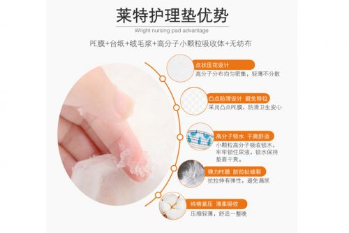 萊特護理墊超薄鎖水,表層干爽不回滲,超強尿液瞬間吸收,源于優(yōu)良的高吸水性樹脂和絨毛漿。在瞬間吸收尿液的同時均勻?qū)Я?,底部防滑緊貼床單,表面始終干爽,棉柔外層加倍柔軟,更舒適更透氣。 幸福生活源于萊特。