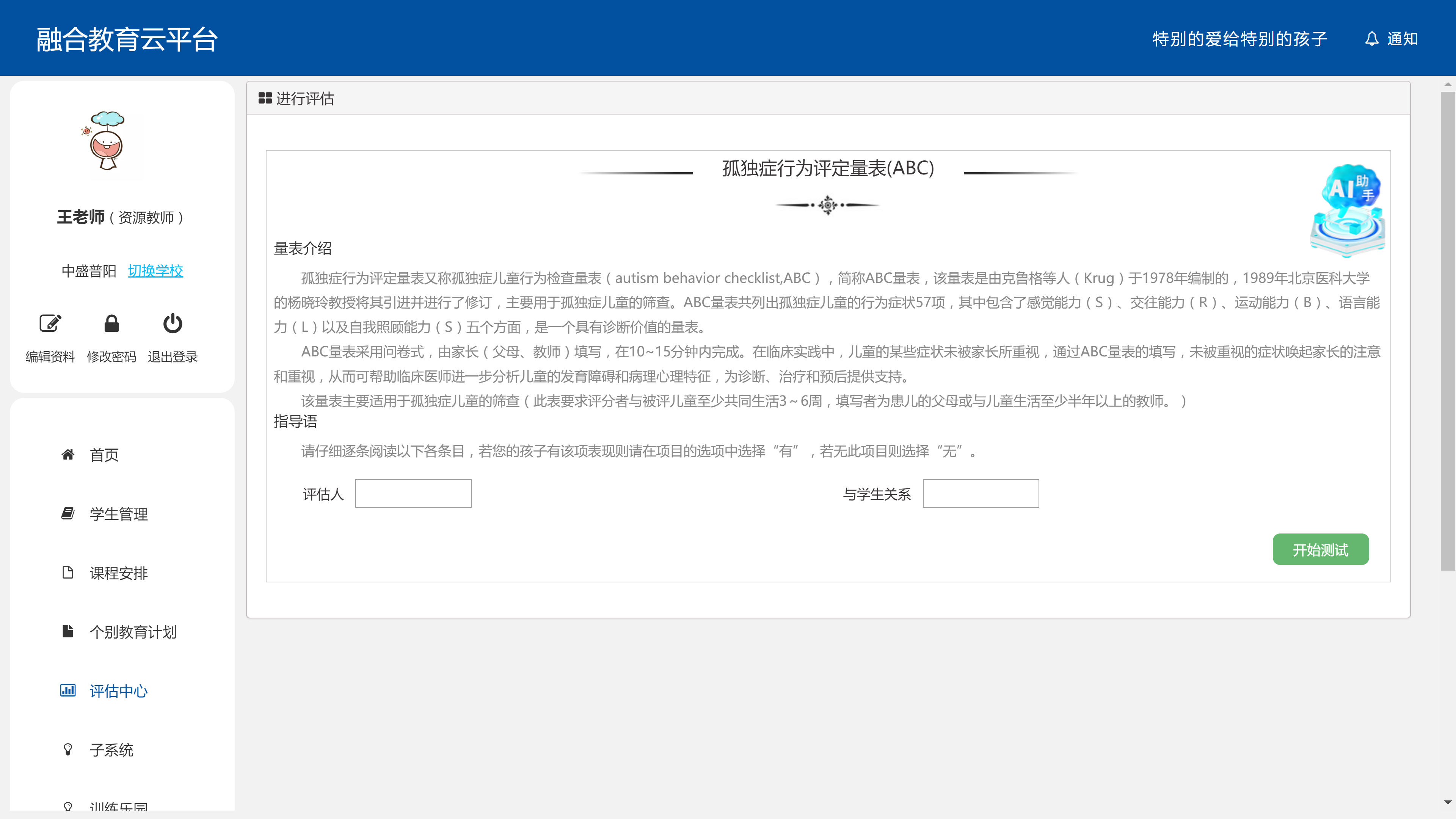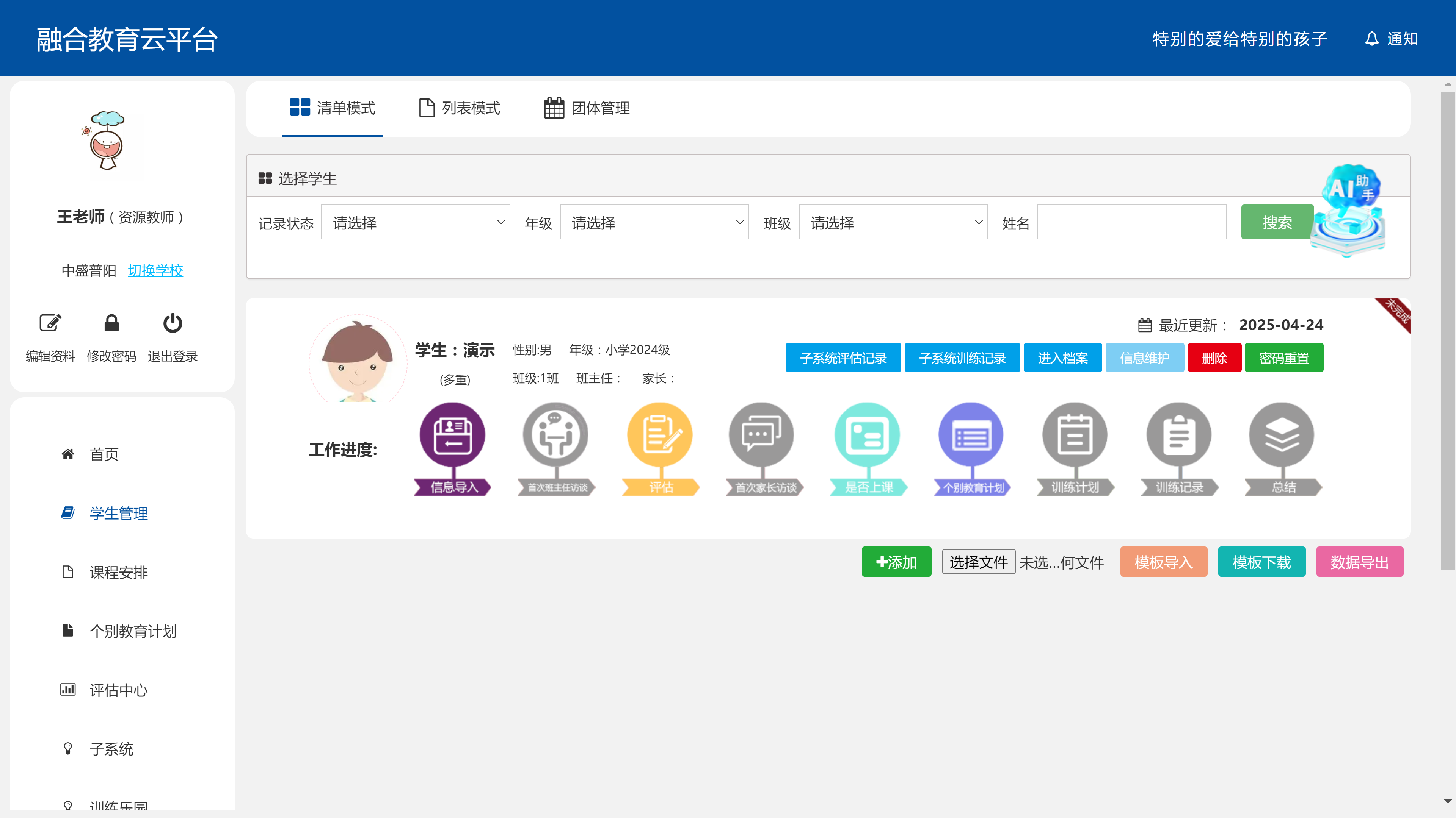 融合教育云平臺(tái)以現(xiàn)代特殊教育體系為背景,全面落實(shí)“一生一案”政策,結(jié)合IEP輔導(dǎo),構(gòu)建完整的學(xué)生檔案,平臺(tái)提供了學(xué)生評(píng)估、IEP個(gè)別教育計(jì)劃制定、豐富的訓(xùn)練課程及資源教師成長(zhǎng)資源。包括學(xué)校端、教師端、學(xué)生端&家長(zhǎng)端四個(gè)端口,可以滿(mǎn)足學(xué)校、學(xué)生、家長(zhǎng)間的融合教育需要。實(shí)現(xiàn)特殊兒童的全面化、人性化管理。