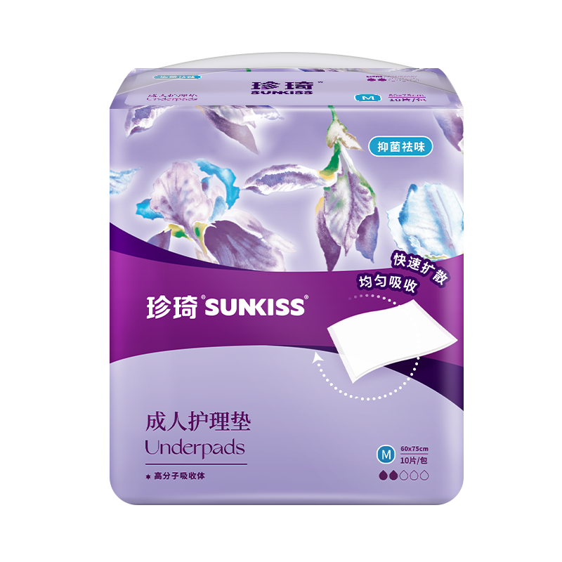 珍琦花樣倍護成人護理墊 ① 高效吸收芯體:進口優(yōu)質(zhì)絨毛漿搭配高鎖水性SAP,雙芯速吸,更高吸收量,更強鎖水性,干爽舒適低回滲 ② 防漏PE底膜:采用全新料PE膜,防潮不悶熱,柔軟不透水,有效防止液體滲漏