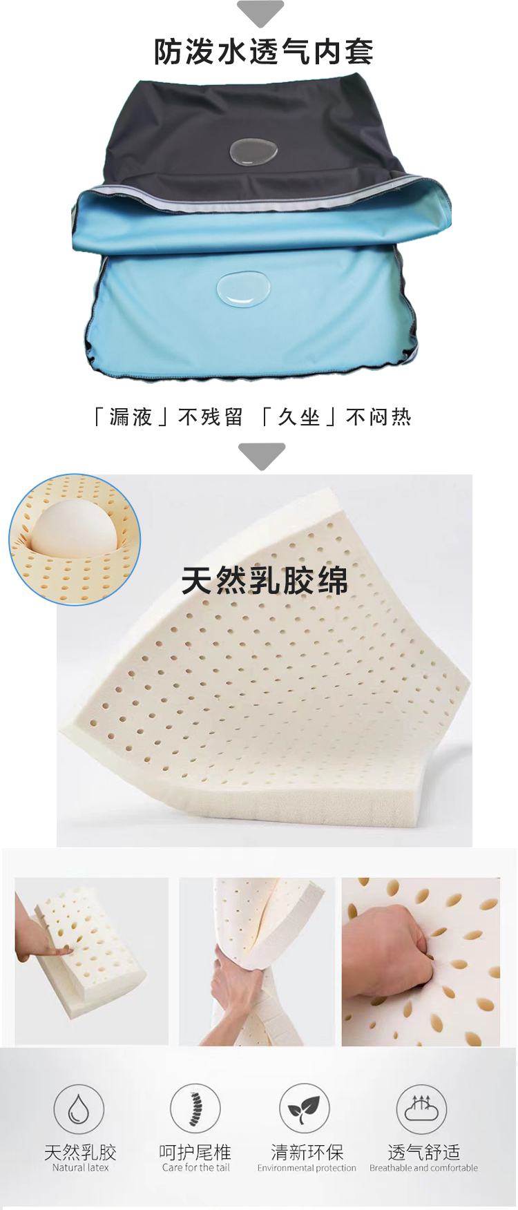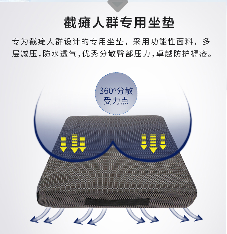 品牌:奧博適 1、材質(zhì) 1、3D高分子空氣纖維 2、減壓氣囊 3、天然乳膠綿 4、防水透氣內(nèi)套 5、抑菌負(fù)離子功能外套 6、備用換洗外套 2、規(guī)格 36×38×8.5cm、38×40×8.5cm、40×42×8.5cm、43×43×8.5cm (36cm以上的任意尺寸可定制,3天內(nèi)交貨) 3、性能 防褥瘡效果最佳,超軟高彈,具優(yōu)秀的舒適性、減壓性、透氣性和緩震功能,防尿液污染,保持臀部持續(xù)