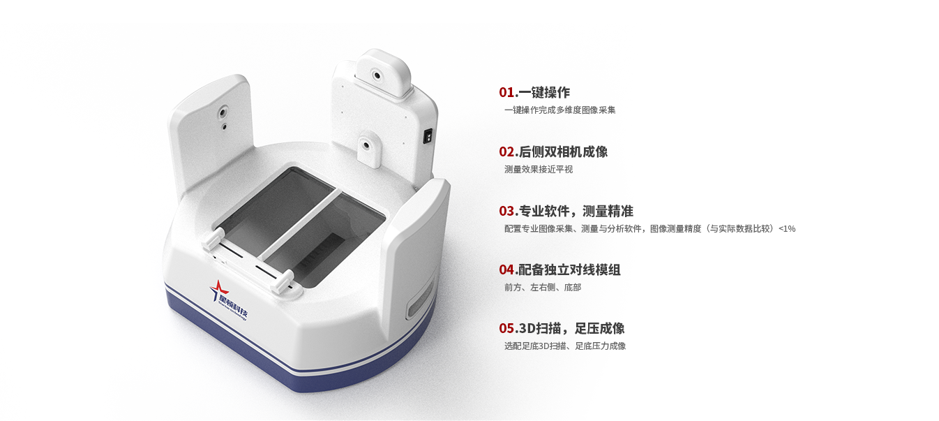 1.FootCam足膝形態(tài)觀察儀為無損、無創(chuàng),快速、有效、可存檔記錄的檢測設(shè)備。 2.用于人足底、足踝、小腿以及膝部的形態(tài)多角度觀察,快速顯示和采集2D圖像,同時(shí)具備快速掃描足底功能,生成三維模型,用于矯形鞋墊定制;可以集成采集足壓分布圖像,進(jìn)行足底壓力分析、步態(tài)分析,定制矯形器具。 3.用戶可以按需求進(jìn)行2D、3D圖像和數(shù)據(jù)的采集與測量,并提供多種圖像與數(shù)據(jù)的分析處理功能,數(shù)據(jù)檔案管理功能。