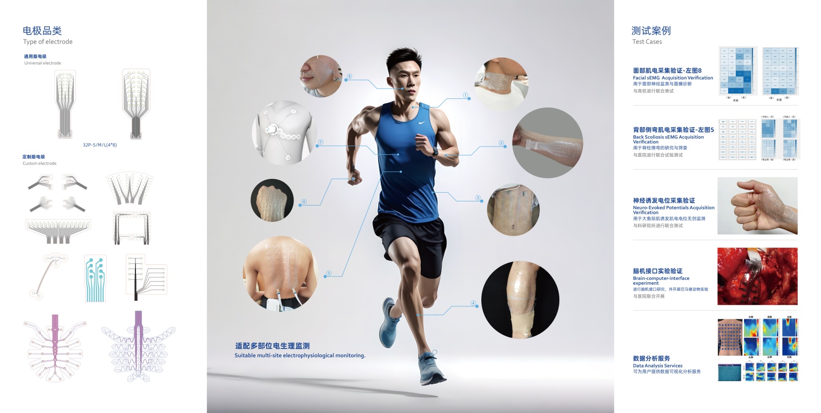 采用自主研發(fā)的醫(yī)用生物導(dǎo)電薄膜,研制新一代高密度柔性可拉伸肌電電極陣列。該電極具備高密度信號采集;形成2D圖像,反映空間信息;可大面積制備,適配人體更多區(qū)域;具有穩(wěn)定采集拉伸性,適配皮膚形變,有效降低運動偽影。相關(guān)產(chǎn)品滿足YY/T 0196-2005醫(yī)藥行業(yè)標準。