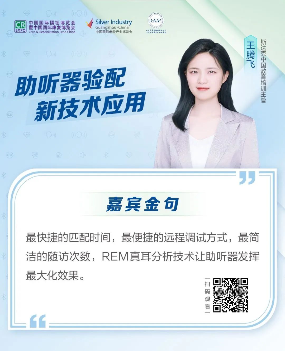 本次活動很榮幸邀請了北京市康復輔具協(xié)會聽力言語康復專委會主任委員王樹峰老師擔任主持嘉賓,斯達克中國教育培訓主管王騰飛,索諾瓦卓越聽力中心特聘講師孫靜,廈門新生科技有限公司CTO李伯陽作為演講嘉賓,吸引了近3000名觀眾在線收看,圍繞助聽器配驗新技術(shù)展開分享。