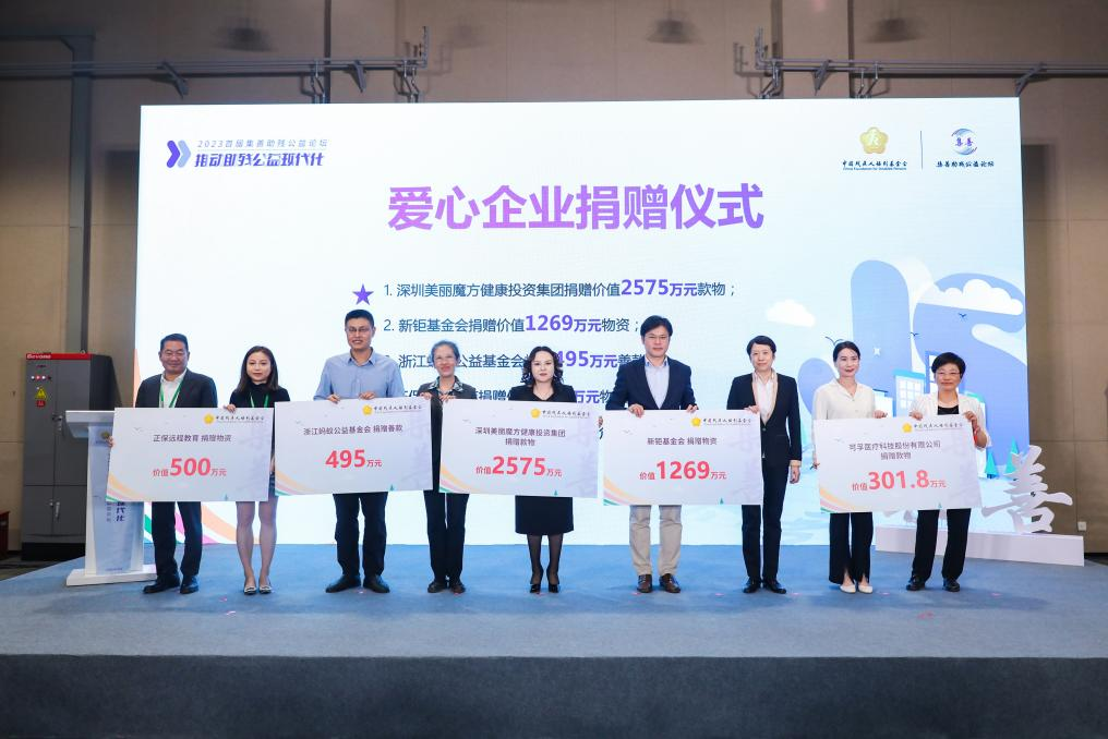 (上三圖為可孚醫(yī)療科技股份有限公司、新矩基金會、深圳美麗魔方健康投資集團、浙江螞蟻公益基金會、正保遠程教育、寶泰歐(北京)假肢矯形器商業(yè)有限責(zé)任公司、上海頌協(xié)醫(yī)療器械有限公司、如新集團、浙江諾爾康神經(jīng)電子科技股份有限公司、亞瑞科爾國際廣告?zhèn)髅剑ū本┯邢薰?、大王(南通)生活用品有限公司、杭州愛聽科技有限公司、明門(中國)幼童用品有限公司、唐山市福愛假肢矯形器有限公司、北京創(chuàng)潔衛(wèi)康科技有限公司等15家愛心企業(yè)和機構(gòu)向中國殘疾人福利基金會捐贈了總價值1.07億元的款物)