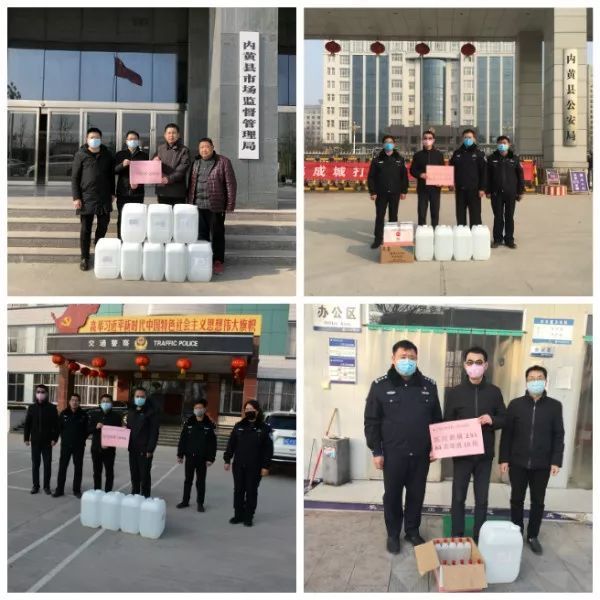 向內(nèi)黃縣市場監(jiān)管局、公安局、內(nèi)黃縣交警大隊、長慶路派出所捐贈醫(yī)用酒精、84消毒液