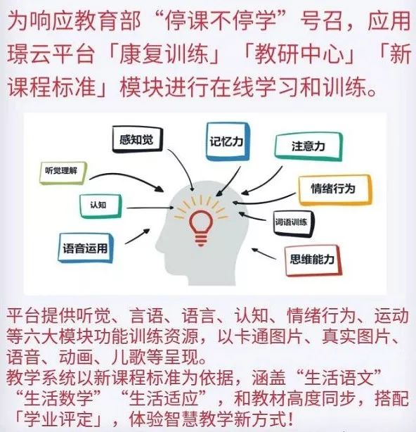 為應(yīng)對因為疫情而導(dǎo)致的推遲開學(xué),解決學(xué)校和學(xué)生無法面對面授課的問題,疫情期間璟云平臺向特殊教育工作者及家庭免費注冊開放,實現(xiàn)特殊教育的停課不停學(xué)!
