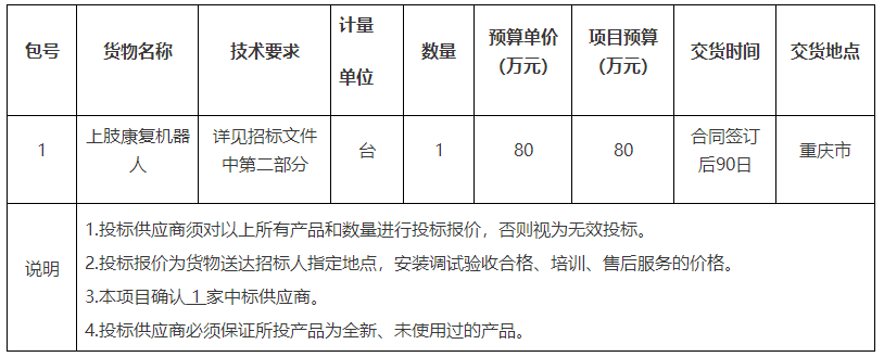項(xiàng)目名稱:重慶市某單位上肢康復(fù)機(jī)器人招標(biāo)公告(2022-JL13(03)-W10330)