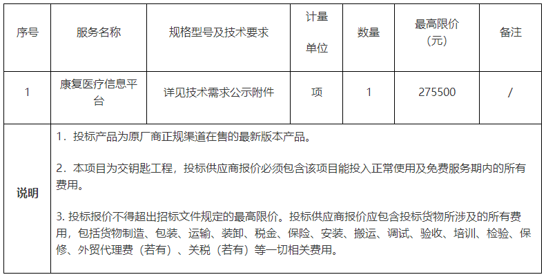 項(xiàng)目名稱:福建省漳州市某醫(yī)院關(guān)于康復(fù)醫(yī)療信息平臺(tái)項(xiàng)目的公開招標(biāo)公告