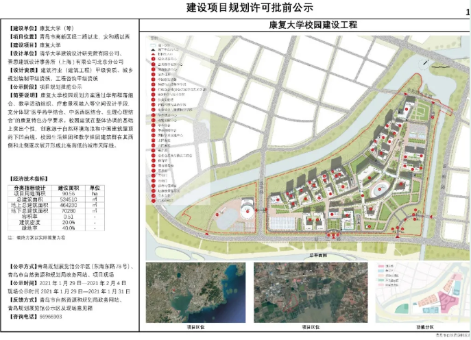據(jù)悉,康復(fù)大學(xué)項目位于青島高新區(qū),項目用地面積90.56公頃,總建筑面積534510平方米,在建筑設(shè)計上,校園生活組團和教學(xué)組團建筑群將形成北高南低的城市天際線。