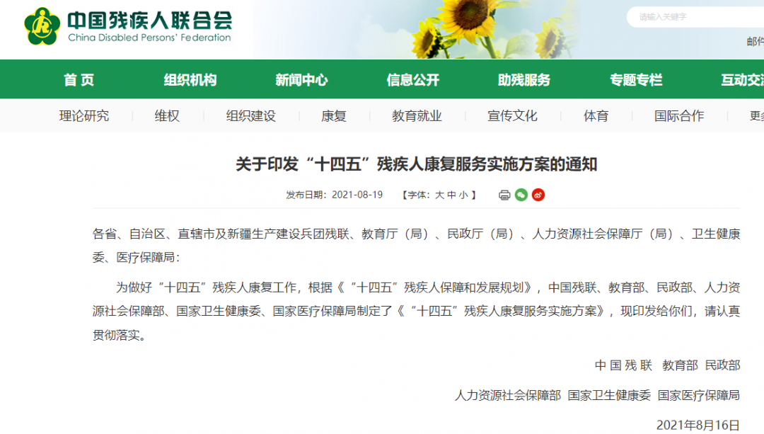 為做好“十四五”殘疾人康復(fù)工作,根據(jù)《“十四五”殘疾人保障和發(fā)展規(guī)劃》,中國殘聯(lián)、教育部、民政部、人力資源社會保障部、國家衛(wèi)生健康委、國家醫(yī)療保障局制定了《“十四五”殘疾人康復(fù)服務(wù)實(shí)施方案》,現(xiàn)印發(fā)給你們,請認(rèn)真貫徹落實(shí)。