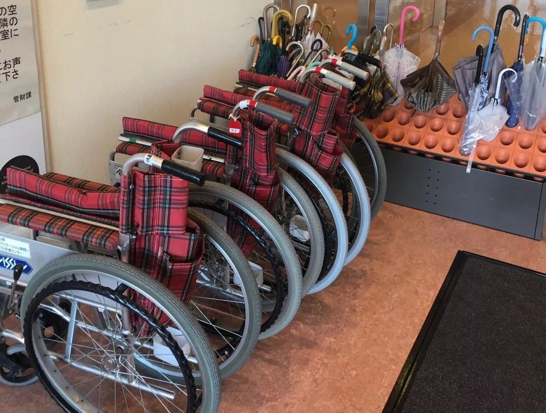 未進(jìn)入大廳,就能在醫(yī)院門口看到整齊擺放一排的“共享”輪椅。