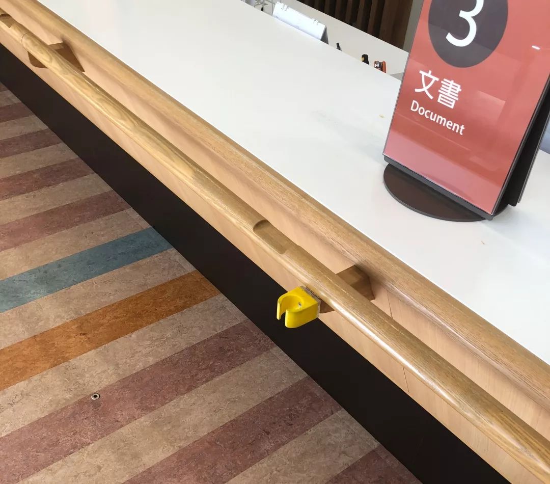 靠近一點(diǎn)便會(huì)發(fā)現(xiàn)接待臺(tái)周邊各種人性化的輔助細(xì)節(jié):扶手欄桿、勾雨傘的凹槽、放拐杖的小扣,一氣呵成:
