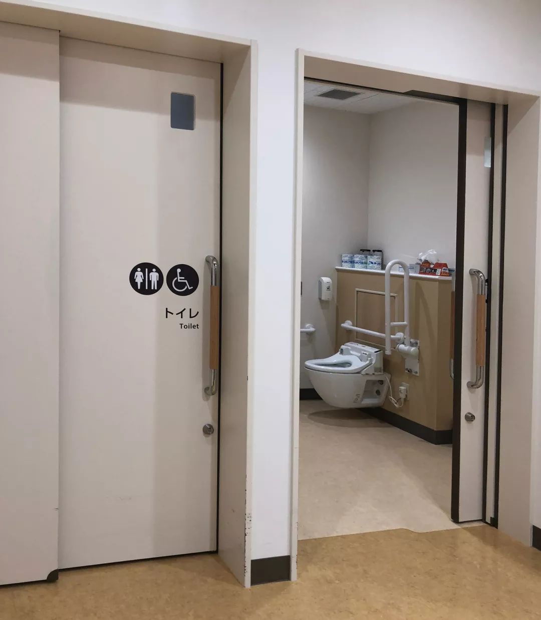 往病房區(qū)走去。在走廊經(jīng)過(guò)了一對(duì)衛(wèi)生間(真的是一對(duì))。衛(wèi)生間采用的推拉門,配備延遲關(guān)閉的五金和門邊防撞條,防止夾手。地上不需要有軌道,避免污垢積聚。另外設(shè)置了兩個(gè)鏡像的衛(wèi)生間,一個(gè)是用右手開(kāi)門及操作,另一個(gè)是用左手,很貼心。這是為單手受傷的患者而考慮設(shè)計(jì)的: