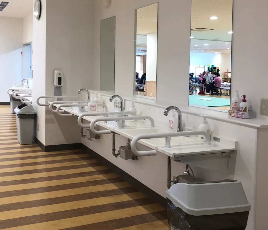 首先是在大廳入口處,兩組并排的洗手池。前排較高給站立者,后排給輪椅使用者。全部都配有獨(dú)立小廚寶和扶手: