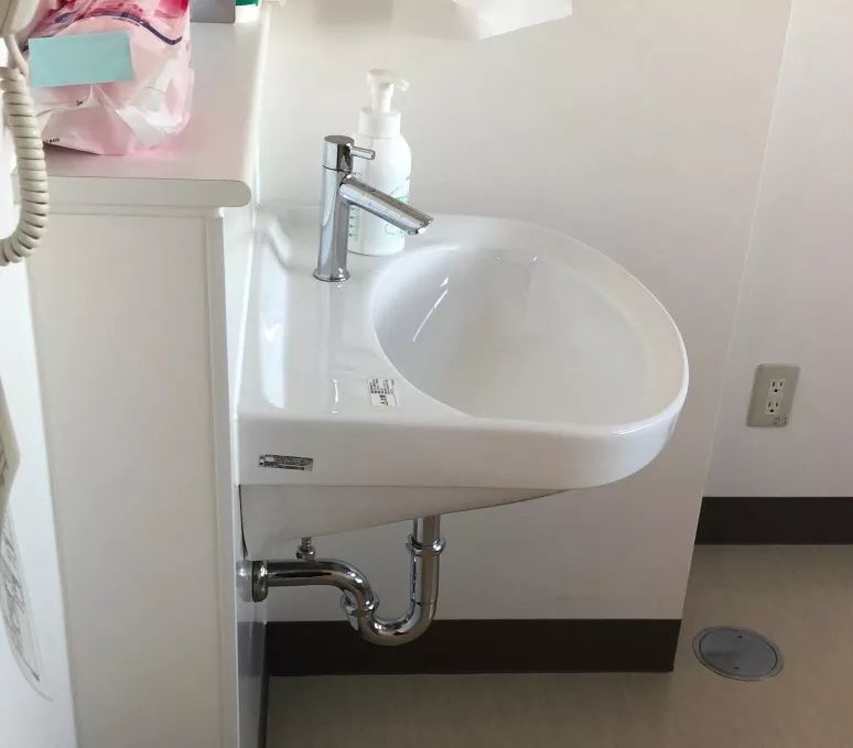 病房前的空間都配有洗手池,門牌下放置消毒液的小凹槽。由于固定的皂液機(jī)與墻面固定的位置沒(méi)法清洗,放這種瓶裝的似乎更為衛(wèi)生,添加消毒液時(shí)也更為方便。