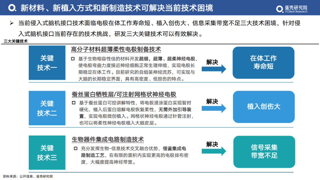 當(dāng)前侵入式腦機(jī)接口技術(shù)面臨電極在體工作壽命短、植入創(chuàng)傷大、信息采集帶寬不足三大技術(shù)困境,針對(duì)侵入式腦機(jī)接口當(dāng)前存在的技術(shù)挑戰(zhàn),研發(fā)三大關(guān)鍵技術(shù)可以有效解決。