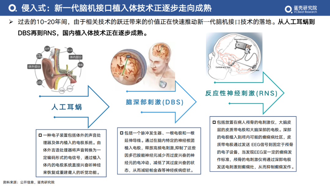 過(guò)去的10-20年間,由于相關(guān)技術(shù)的躍遷帶來(lái)的價(jià)值正在快速推動(dòng)新?代腦機(jī)接?技術(shù)的落地。從人工耳蝸到DBS再到RNS,國(guó)內(nèi)植入體技術(shù)正在逐步成熟。