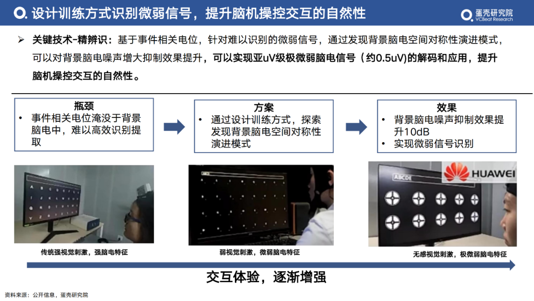 關(guān)鍵技術(shù)-精辨識(shí):基于事件相關(guān)電位,針對(duì)難以識(shí)別的微弱信號(hào),通過(guò)發(fā)現(xiàn)背景腦電空間對(duì)稱性演進(jìn)模式,可以對(duì)背景腦電噪聲增大抑制效果提升,可以實(shí)現(xiàn)亞uV級(jí)極微弱腦電信號(hào)(約0.5uV)的解碼和應(yīng)用,提升腦機(jī)操控交互的自然性。