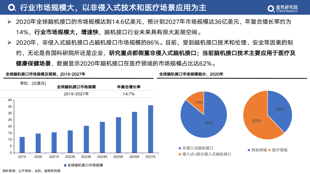 2020年,非侵入式腦機(jī)接口占腦機(jī)接口市場(chǎng)規(guī)模的86%。目前,受到腦機(jī)接口技術(shù)和倫理、安全等因素的制約,無(wú)論是各國(guó)科研院所還是企業(yè),研究重點(diǎn)都側(cè)重非侵入式腦機(jī)接口;當(dāng)前腦機(jī)接口技術(shù)主要應(yīng)用于醫(yī)療及健康保健場(chǎng)景,數(shù)據(jù)顯示2020年腦機(jī)接口在醫(yī)療領(lǐng)域的市場(chǎng)規(guī)模占比達(dá)62%。
