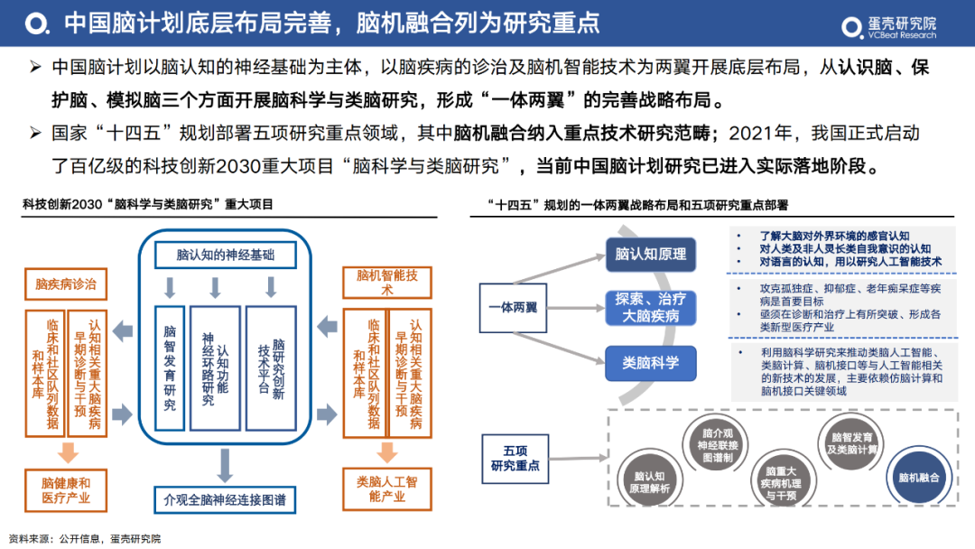國(guó)家“十四五”規(guī)劃部署五項(xiàng)研究重點(diǎn)領(lǐng)域,其中腦機(jī)融合納入重點(diǎn)技術(shù)研究范疇;2021年,我國(guó)正式啟動(dòng)了百億級(jí)的科技創(chuàng)新2030重大項(xiàng)目“腦科學(xué)與類腦研究”,當(dāng)前中國(guó)腦計(jì)劃研究已進(jìn)入實(shí)際落地階段。