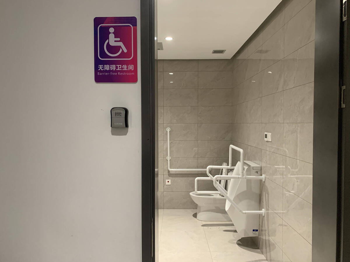 對殘疾人的關(guān)懷,還藏在細(xì)節(jié)里。今年,三人制籃球館內(nèi)的無障礙衛(wèi)生間又進(jìn)行了調(diào)整,傾斜的鏡子、高度經(jīng)過多次調(diào)整的扶手和用具,都讓殘疾人和有需要的人群使用更舒心。值得一提的是,衛(wèi)生間門口還有一處不起眼的特別設(shè)置。“它是個應(yīng)急保障措施,這個密碼鎖里面放著一把應(yīng)急鑰匙,一旦殘疾人自己在衛(wèi)生間發(fā)生意外,工作人員就可以在外面打開門,及時進(jìn)行救援。”三人制籃球館物業(yè)工作人員燕永會介紹。