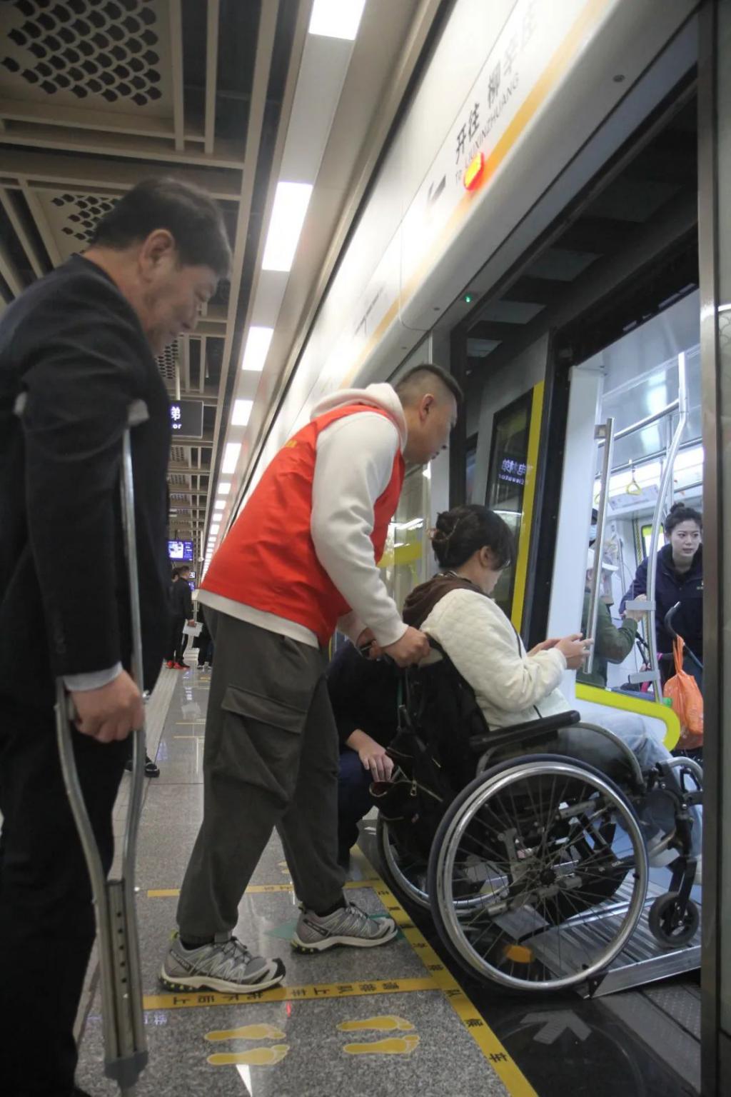 隨后殘疾人朋友通過(guò)無(wú)障礙輪椅渡板登上地鐵列車,在列車上,工作人員向殘疾人朋友介紹了地鐵列車設(shè)備設(shè)施配置情況,以及列車運(yùn)行中為防止輪椅移位設(shè)置的輪椅固定帶,充分保障殘疾人朋友的出行安全。