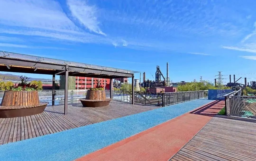 從老舊工業(yè)園轉(zhuǎn)身,只為未來(lái)休閑、商業(yè)兩相宜的可持續(xù)發(fā)展與宜居生活要素。高線公園是首鋼園區(qū)“地下-地面-空中”三級(jí)立體慢行系統(tǒng)的重要組成部分。其中,群明湖北側(cè)的空中步道長(zhǎng)約670米,通過(guò)水體景觀和現(xiàn)有的管廊的結(jié)合設(shè)置雙層平臺(tái)。步道西部順接永定河濱河休閑公園,整體打造京西綠色生態(tài)健康廊道。