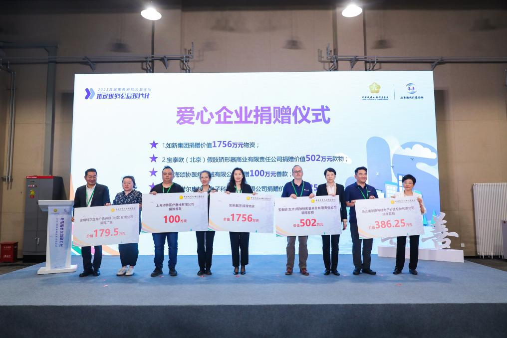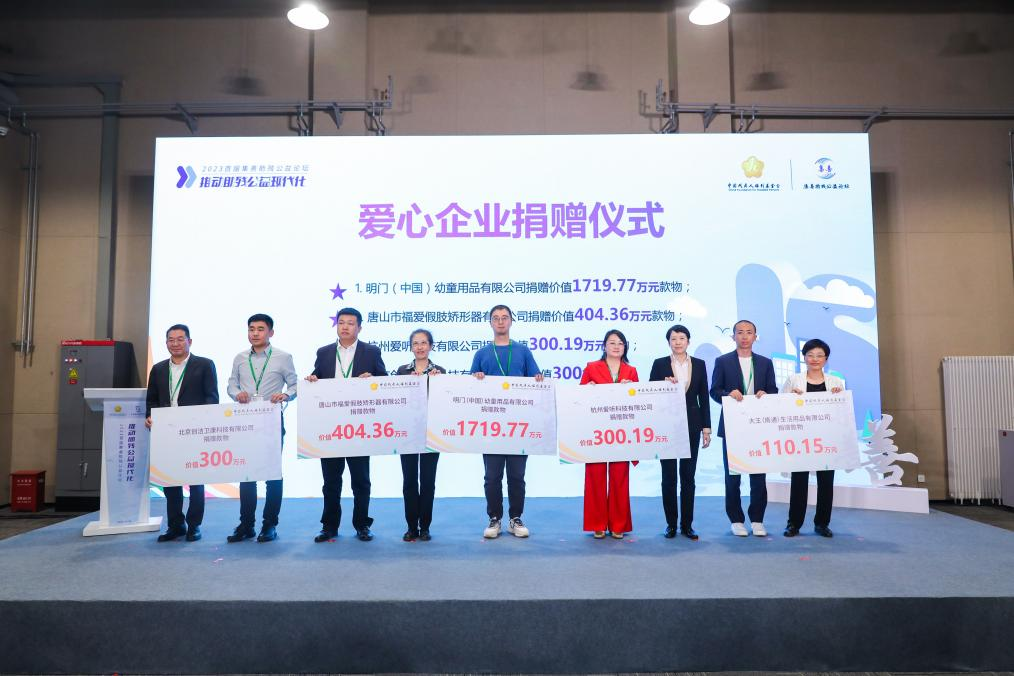 (上三圖為可孚醫(yī)療科技股份有限公司、新矩基金會(huì)、深圳美麗魔方健康投資集團(tuán)、浙江螞蟻公益基金會(huì)、正保遠(yuǎn)程教育、寶泰歐(北京)假肢矯形器商業(yè)有限責(zé)任公司、上海頌協(xié)醫(yī)療器械有限公司、如新集團(tuán)、浙江諾爾康神經(jīng)電子科技股份有限公司、亞瑞科爾國際廣告?zhèn)髅剑ū本┯邢薰?、大王(南通)生活用品有限公司、杭州愛聽科技有限公司、明門(中國)幼童用品有限公司、唐山市福愛假肢矯形器有限公司、北京創(chuàng)潔衛(wèi)康科技有限公司等15家愛心企業(yè)和機(jī)構(gòu)向中國殘疾人福利基金會(huì)捐贈(zèng)了總價(jià)值1.07億元的款物)