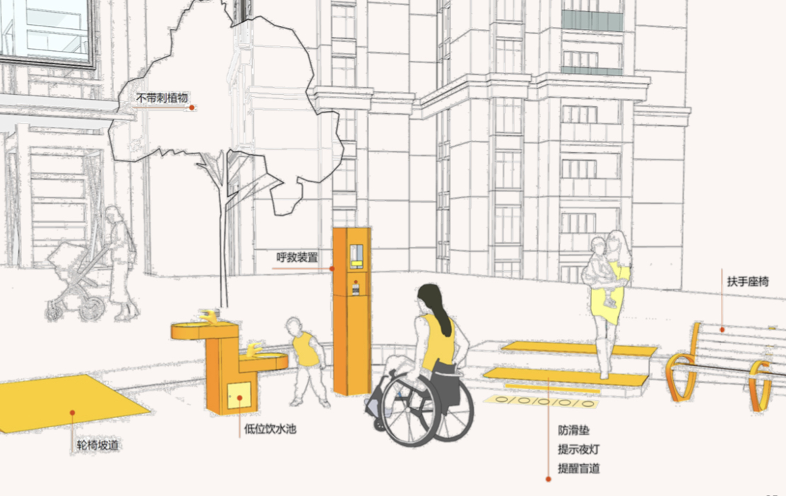 《規(guī)劃》要求,社區(qū)內(nèi)配套服務(wù)設(shè)施應(yīng)符合無障礙服務(wù)設(shè)計要求,有條件的還應(yīng)結(jié)合物聯(lián)網(wǎng)提供網(wǎng)購快遞到戶、外賣送餐到戶、呼叫醫(yī)療救助、安排志愿服務(wù)等社區(qū)共享服務(wù)。社區(qū)內(nèi)主要室外活動場所設(shè)有臺階時,其臺階起止處應(yīng)設(shè)置提示夜燈、提示標(biāo)識和提示盲道,應(yīng)配置具有扶手和靠背的休息座椅。