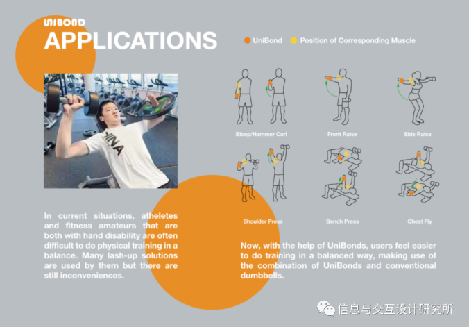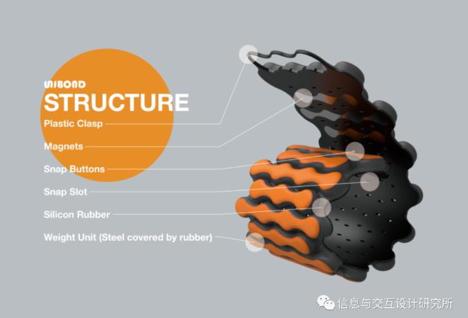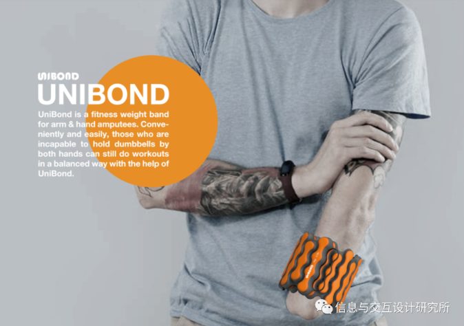 UniBond是一款適合手臂和手部截肢者的健身配重帶。無法雙手同時握住啞鈴的人,在UniBond的幫助下,仍然可以方便、輕松地進(jìn)行均衡鍛煉。用戶可以用他/她有能力的手將它纏繞在另一個人的手腕上,然后卡扣和磁鐵使其保持緊密和穩(wěn)定。此外,外觀設(shè)計和明亮清新的色彩選擇給人以力量和活力的感覺,鼓勵用戶進(jìn)行鍛煉。