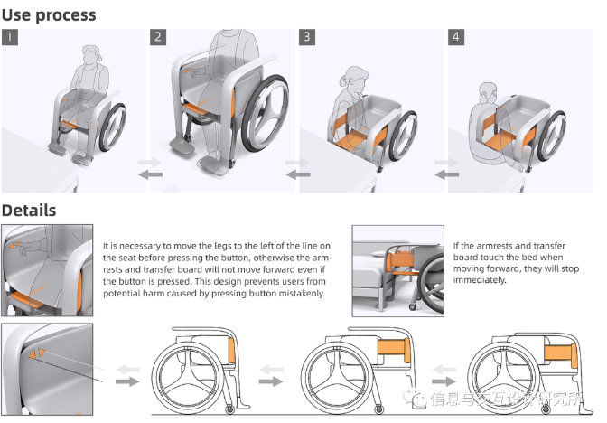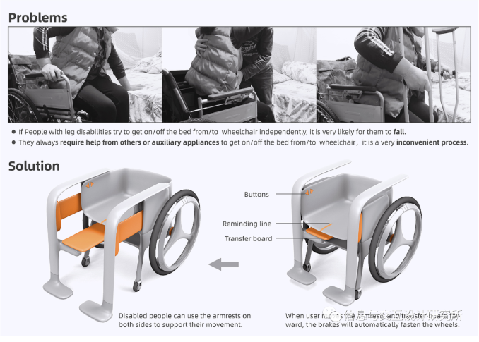 通過在輪椅上設(shè)計可伸收的扶手和轉(zhuǎn)移板,方便腿部殘疾人士不需要他人的幫扶或者輔助器具,利用自身力量挪動就可以自行上下床。這種上下床方式既安全又省力。
