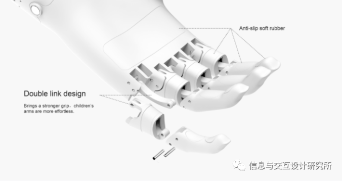 創(chuàng)新的抓握結(jié)構(gòu)更省力抓握性強(qiáng),可調(diào)節(jié)的拉力線松緊結(jié)構(gòu)滿足長時間使用損耗仍保持最佳驅(qū)動力,采用3D打印生產(chǎn)方式,成本低,且可定制化設(shè)計,舒適的人機(jī)設(shè)計,滿足6-12歲兒童佩戴的舒適性。