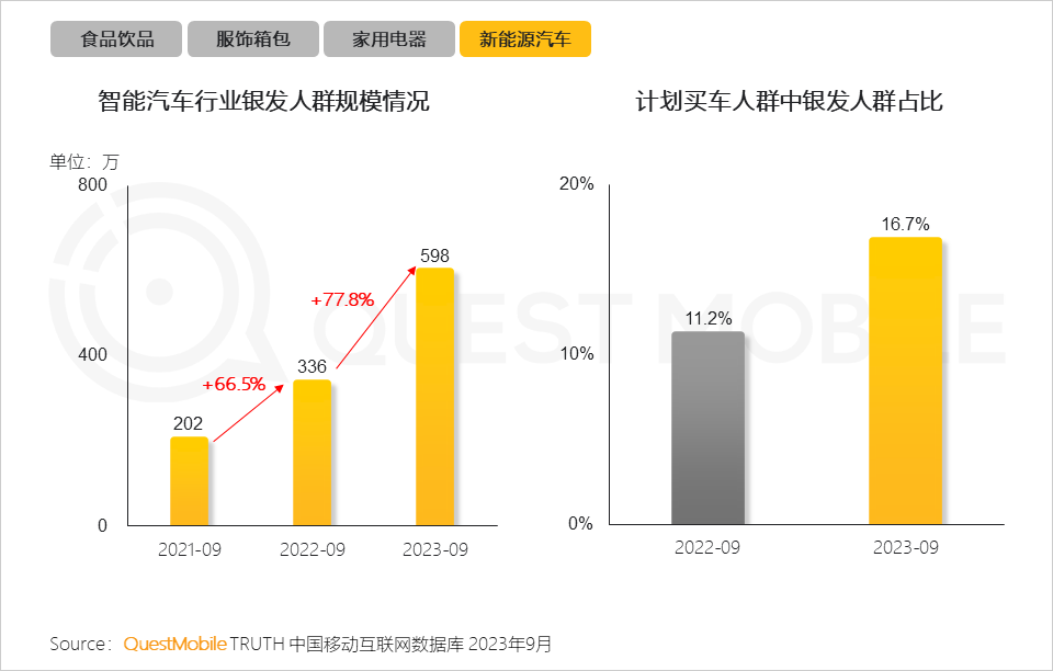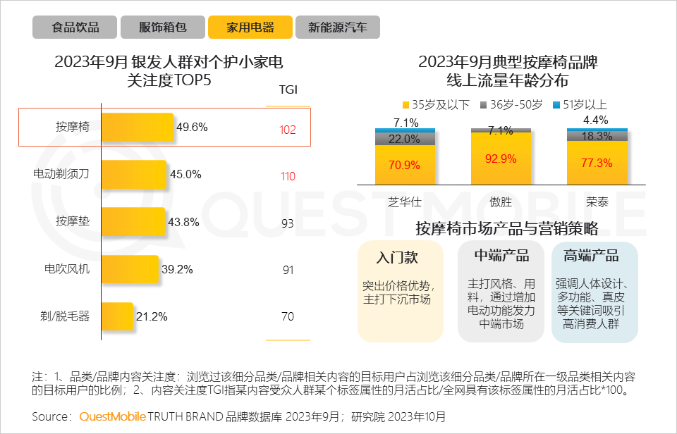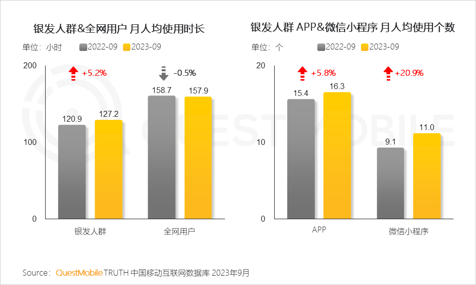 QuestMobile數(shù)據(jù)顯示,截止到2023年9月,銀發(fā)人群用戶規(guī)模已達(dá)到3.25億,同比增長了7.6%;全網(wǎng)占比已經(jīng)達(dá)到26.5%,同比提高了1.3個百分點(diǎn)。同時,銀發(fā)群體線上消費(fèi)能力、消費(fèi)意愿也在提升,9月份,銀發(fā)人群千元以上消費(fèi)能力占比較去年同期增加了1.6%,中高端消費(fèi)意愿占比較去年同期增加了2.4%。銀發(fā)經(jīng)濟(jì)消費(fèi)潛力如何挖掘?不妨看報告吧。