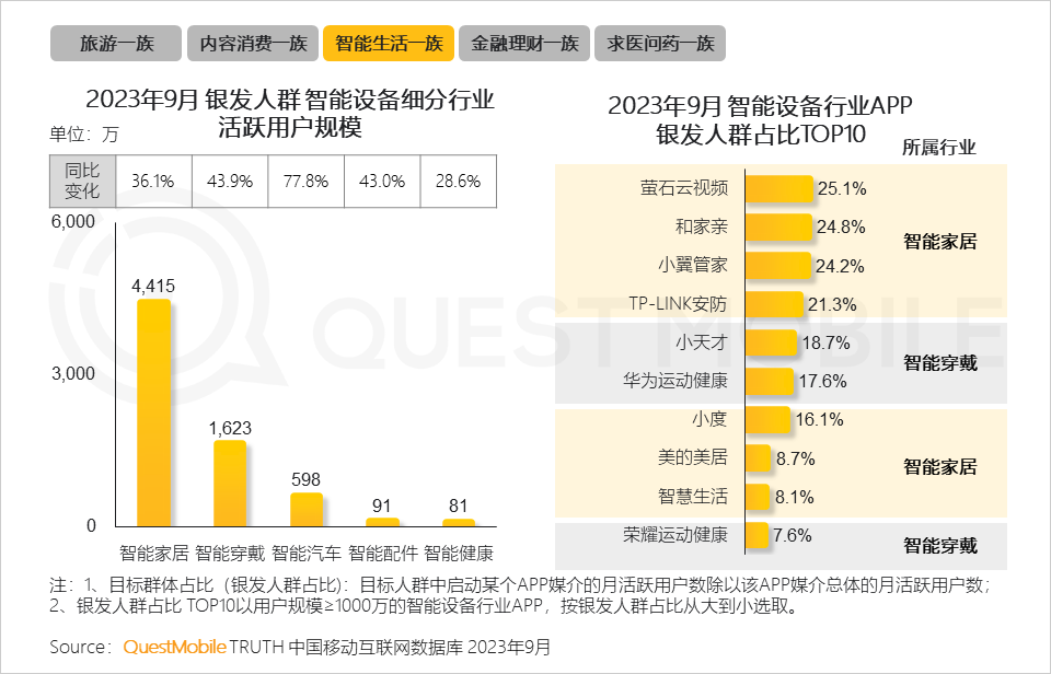 6、伴隨AIoT的智能化和易用性發(fā)展,銀發(fā)人群逐步跨過“數(shù)字鴻溝”,開始融入智能生活,首選智能家居,表現(xiàn)在超4千萬用戶使用智能家居APP,并向智能穿戴、智能汽車等類型應(yīng)用快速蔓延。