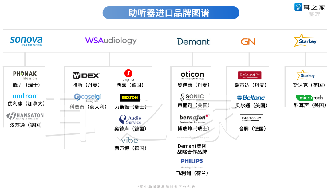 這五大聽(tīng)力巨頭分別是:Sonova索諾瓦(峰力、優(yōu)利康、漢莎通),WSA(西嘉、唯聽(tīng)、力斯頓),戴蒙特Demant(奧迪康、聲麗可、博瑞峰),GN Resound(瑞聲達(dá)、貝爾通),Starkey(斯達(dá)克、科耳聲)。