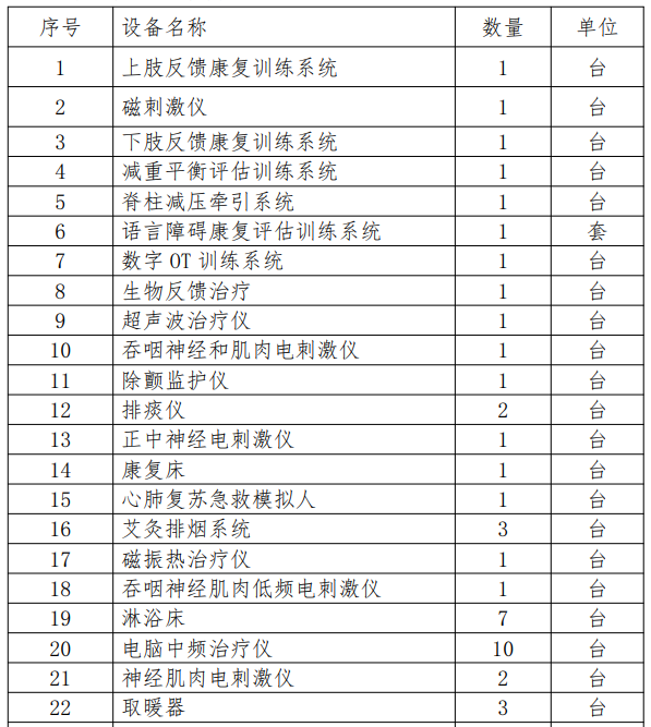 采購需求:三維干擾電治療儀、中低頻治療儀、磁振熱治療儀、沖擊波物理治療系統(tǒng)、空氣波壓力循環(huán)治療儀、超激光疼痛治療儀、電動牽引床、訓(xùn)練用扶梯(雙向)、聯(lián)動升降平行杠、肋木(帶肩梯)、升降單人站立架、抽屜式階梯、股四頭肌訓(xùn)練板、簡易運(yùn)動訓(xùn)練套裝、踝關(guān)節(jié)矯正板、矯正鏡、醫(yī)師椅(不帶靠背)、診療臺、角度尺、楔形墊、手支撐器、分指板、滾筒、OT綜合訓(xùn)練臺、上下肢主被動訓(xùn)練系統(tǒng)、床邊下肢主被動訓(xùn)練系統(tǒng)、上肢康復(fù)機(jī)器人、腕關(guān)節(jié)智能康復(fù)機(jī)器人、踝關(guān)節(jié)智能康復(fù)機(jī)器人、小數(shù)字OT訓(xùn)練系統(tǒng)、數(shù)字OT評估與訓(xùn)練系統(tǒng)、外骨骼:步態(tài)與平衡功能訓(xùn)練評估系統(tǒng)、生物反饋刺激儀(吞咽成人版)、BOBATH床、三段多體位治療床、電動起立床、脈沖針灸治療儀、特定電磁波治療器(TDP)、手搖式病床、床頭柜、多參數(shù)監(jiān)護(hù)儀、微量注射泵,詳見招標(biāo)文件第二章采購需求。