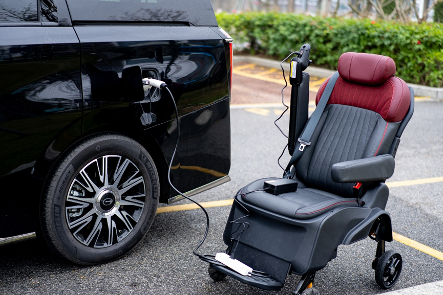 相比于2021年推出的M8福祉版,E9電動(dòng)福祉版最大的特點(diǎn)在于——可分離式的福祉座椅,座椅直接就能“下地跑”,直接變成電動(dòng)輪椅使用。
