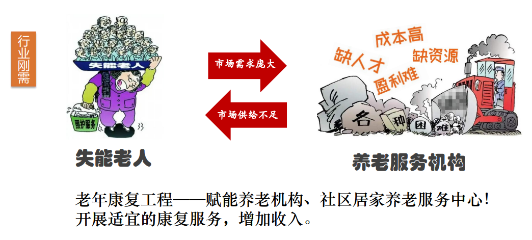 當(dāng)前養(yǎng)老行業(yè)面臨著成本高漲、人才短缺、盈利困難、資源匱乏等諸多問(wèn)題,導(dǎo)致市場(chǎng)供給不足。養(yǎng)老服務(wù)機(jī)構(gòu)、社區(qū)養(yǎng)老服務(wù)中心在失能老人的護(hù)理方面面臨諸多挑戰(zhàn)。為了解決這一系列問(wèn)題,老年康復(fù)工程應(yīng)運(yùn)而生。該工程旨在賦能養(yǎng)老機(jī)構(gòu)和社區(qū)居家養(yǎng)老服務(wù)中心,開(kāi)展適宜的康復(fù)服務(wù)以增加收入。